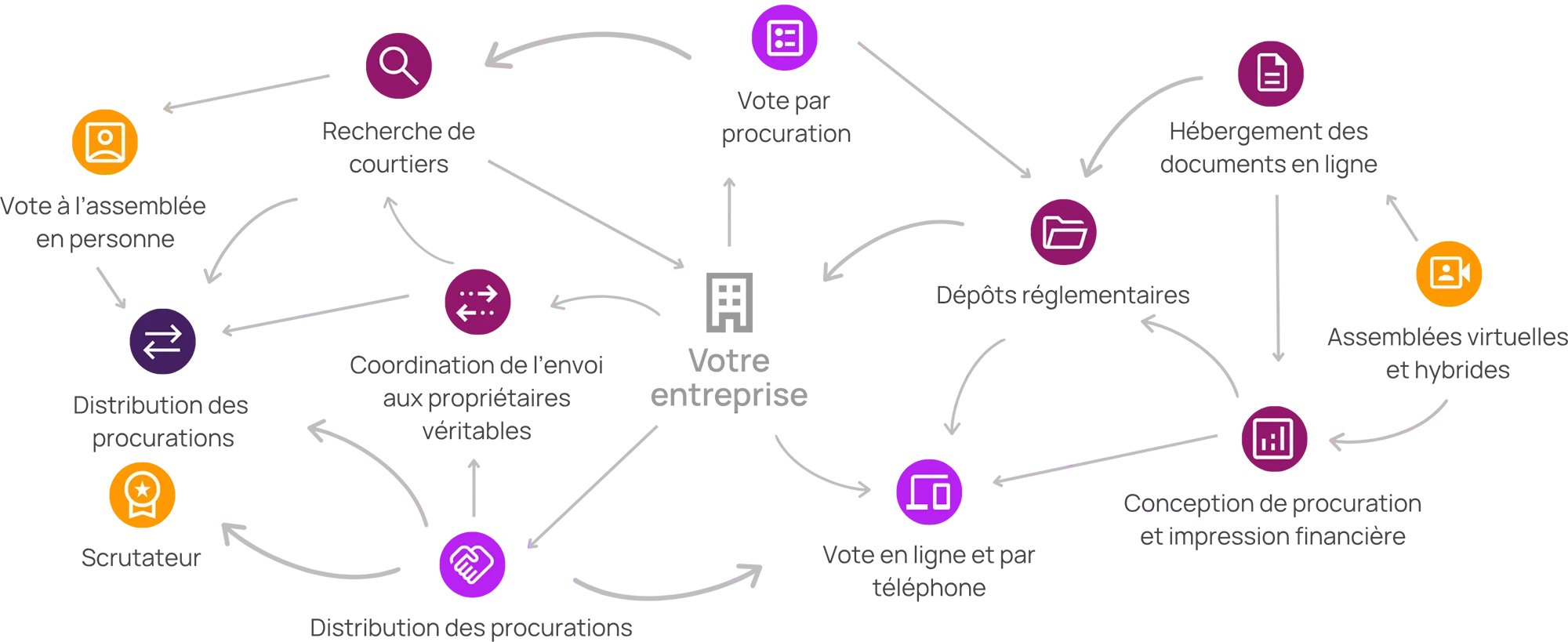 Adaptés aux besoins propres à votre entreprise, nos services couvrent chaque étape du cycle de votre assemblée annuelle. Que vous organisiez une assemblée virtuelle, en personne ou hybride, nous en assurons l’exécution impeccable grâce à l’appui d’experts et de technologies performantes, pour vous offrir confiance et tranquillité d’esprit et en garantir le bon déroulement.